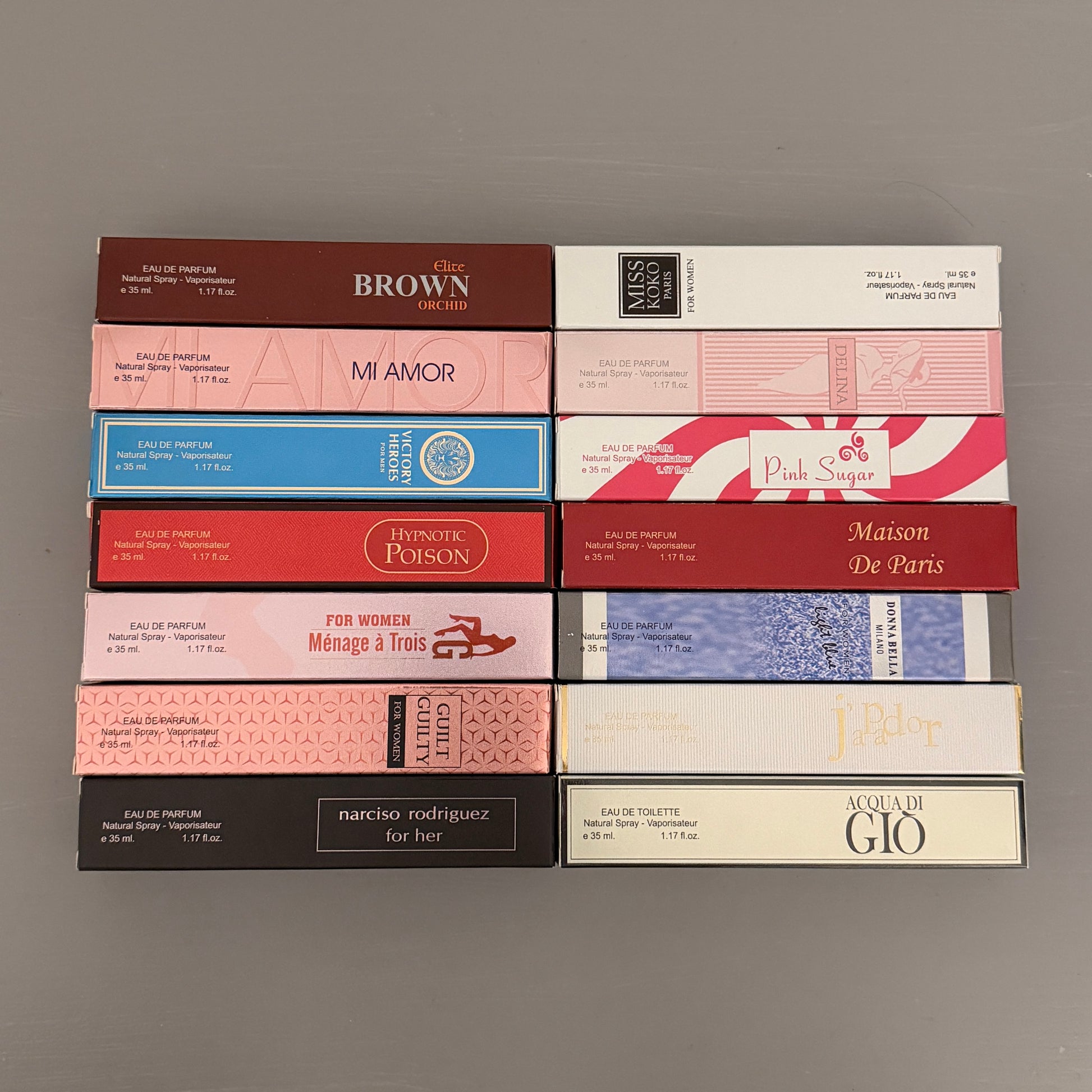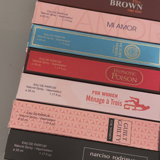 ✨ Random mix from these 14 options: Brown Orchid, Miss World, Mi Amor, Hypnotic Poison, Maison De Paris, Pink Sugar, Menage à Trois, Donna Bella, J’adore, Acqua di Gio, Narciso Rodriguez, Guilty, Light Blue, and Hermes.